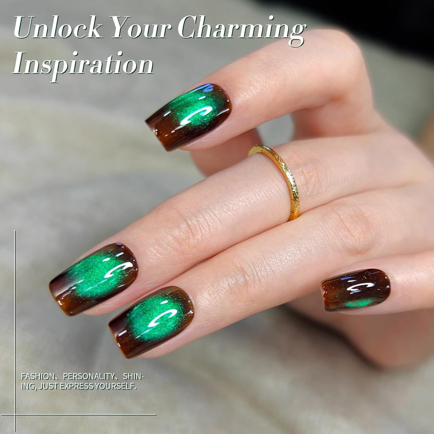 • PACKAGE CONTENTS: 1 bottle 15ml brown green cat magnetic eye gel nail polish, compared with traditional gel polish, our magnetic gel nail polish has a higher gloss and silky effect, just like ceramic gloss, making your fingertips bloom with attractive charm. This Retro brown green cat magnetic eye gel nail polish will appear differently in different angles and light.