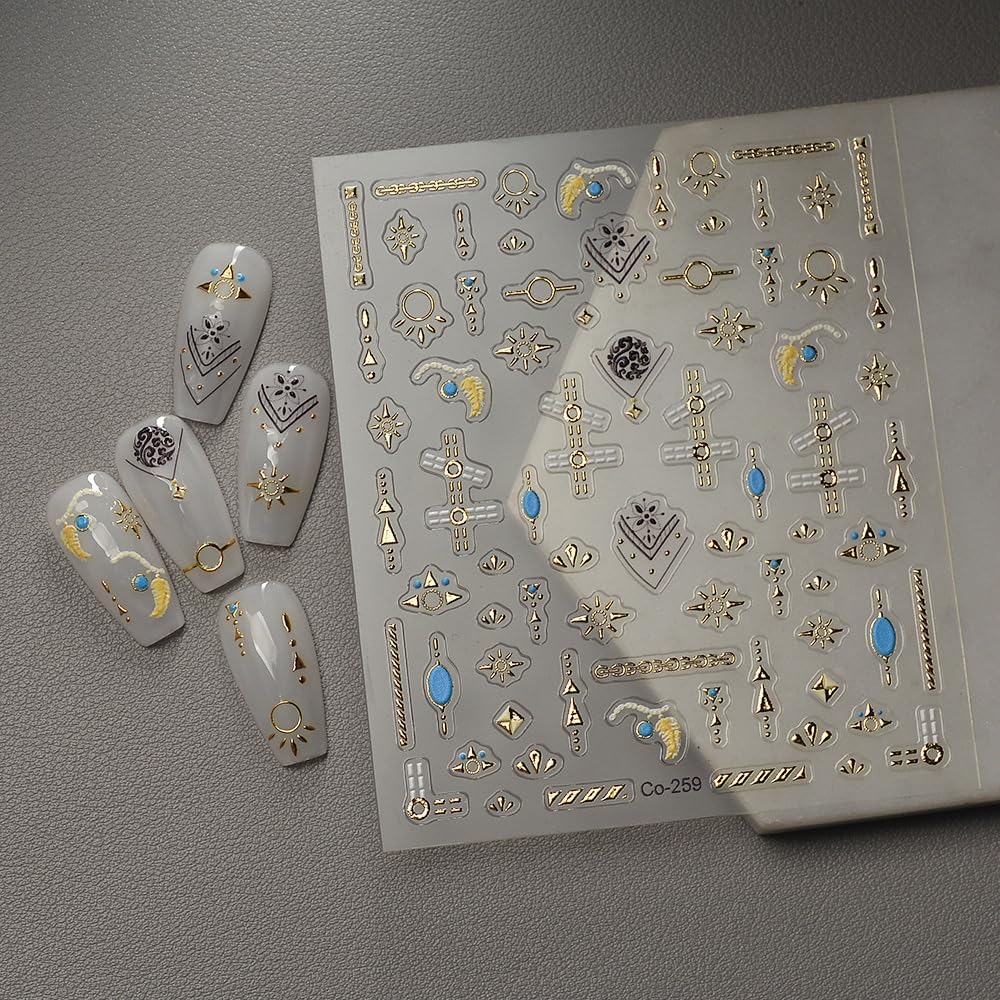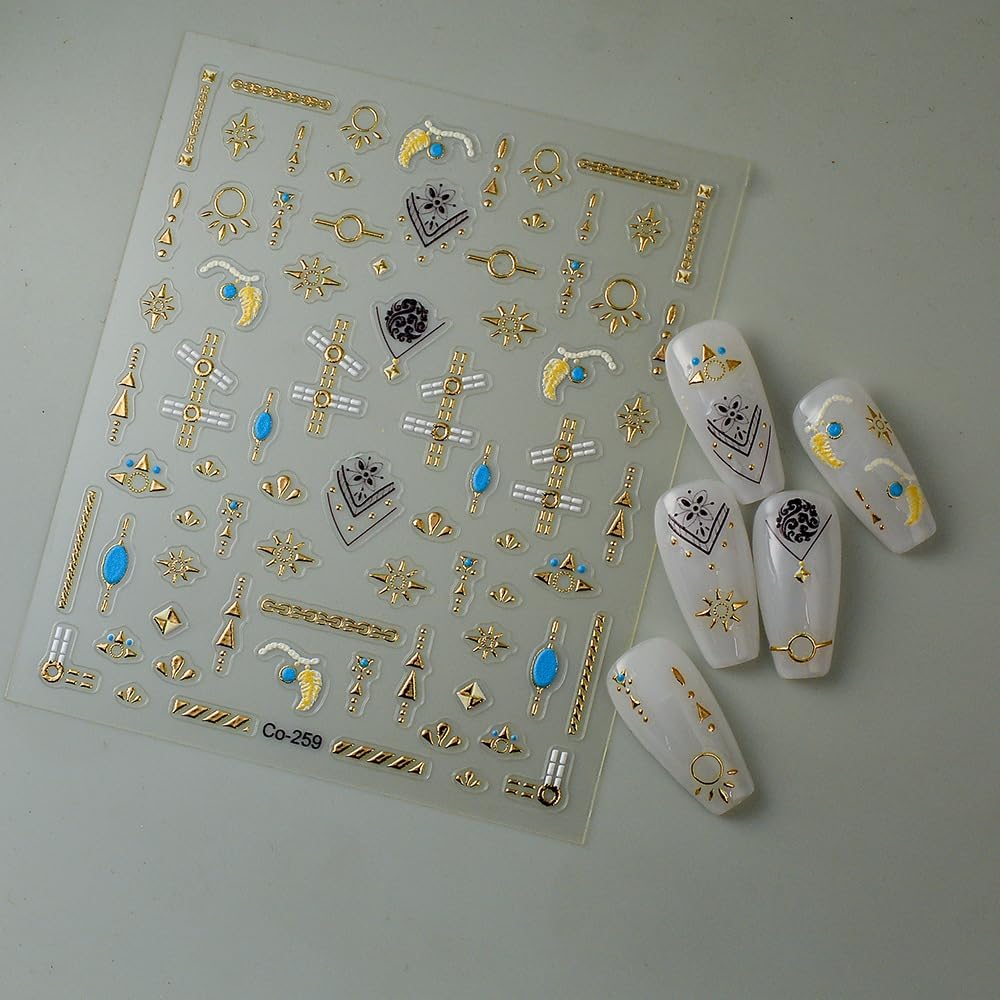 Gold Fall Nail Art Stickers 5D Embossed Geometric Bohemian Nail Stickers, Self-Adhesive Durable Nail Art Decals for Women Girls, Nail Wraps Decoration Manicure for DIY Acrylic Nail Accessories
