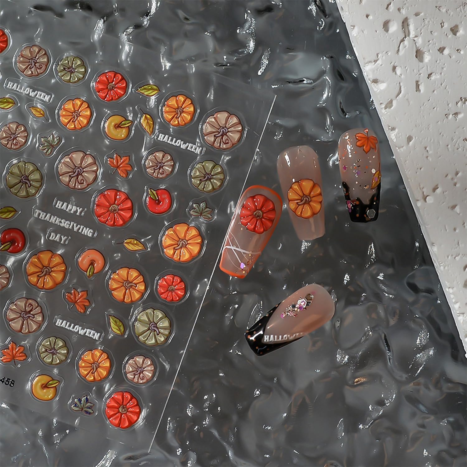 1 Sheets Fall Nail Stickers for Nail Art 5D Self-Adhesive Embossed Pumpkin Nail Art Stickers Autumn Leaves Nail Decals Thanksgiving Nail Design Sticker for Women Nail Decoration