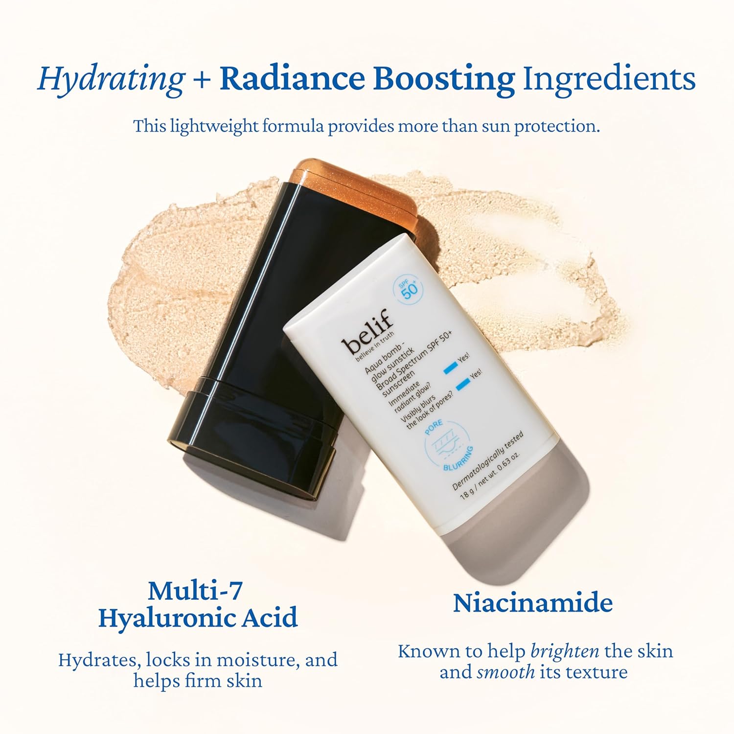 belif Aqua Bomb Niacinamide Sunscreen Stick SPF 50+ PA++++ – Korean Sunstick for Face with Hyaluronic Acid, No White Cast, Lightweight Velvet Finish, Daily UV Protection, Semi-Matte Glow, 0.63 oz