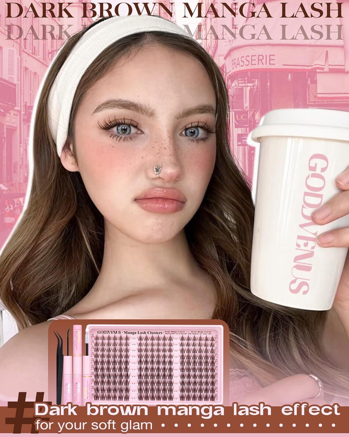 • DIY Lash Cluster Kit for Natural Brown Manga Look: Dark brown lash fibers create soft, defined eyes without the harshness of black cluster lashes – cute for achieving the trending "manga eye" aesthetic with a subtle, everyday glam finish.