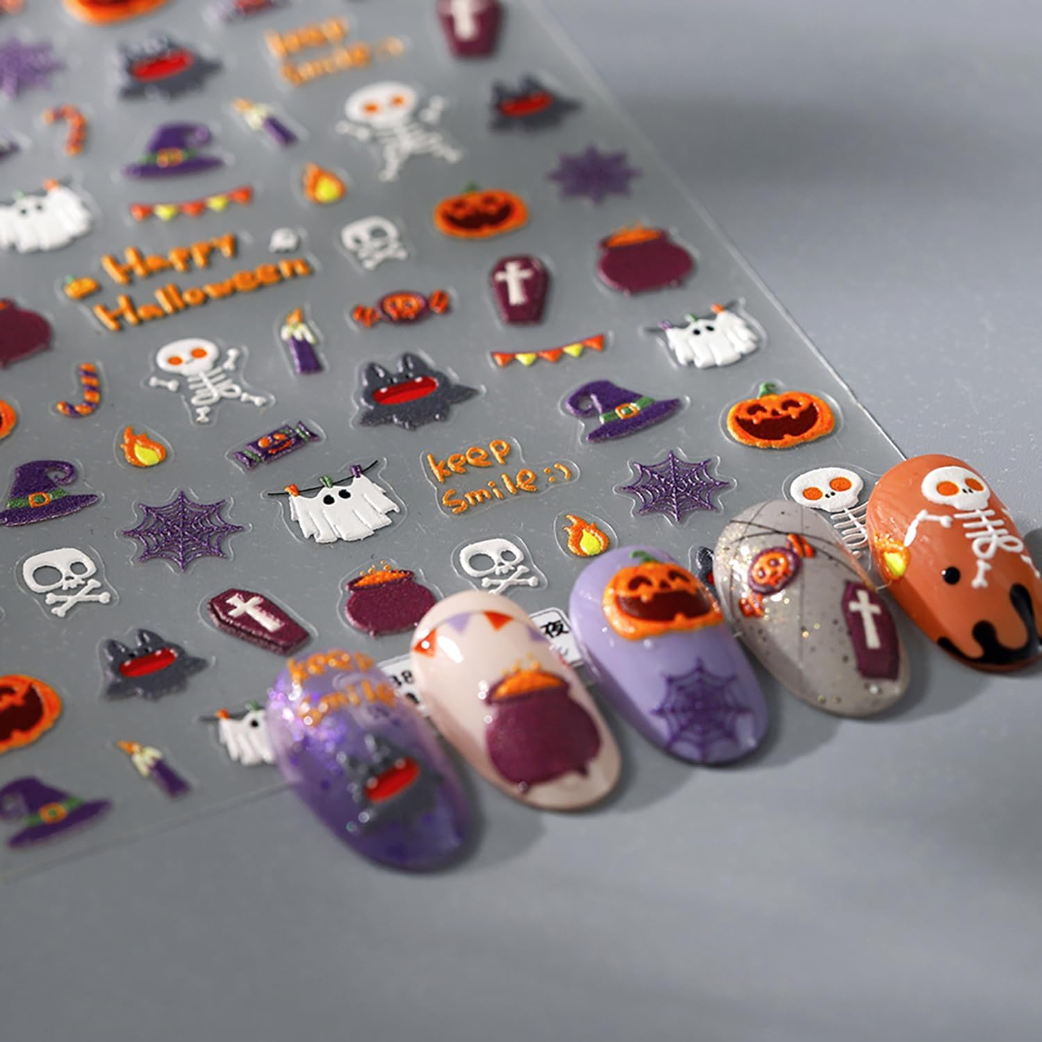 Halloween Nail Art Stickers 5D Embossed Cute Ghost Nail Decals for Nail Art Designs Self Adhesive Skull Spider Web Nail Stickers Pumpkin Bat Nail Supplies for Women Nails DIY Accessores