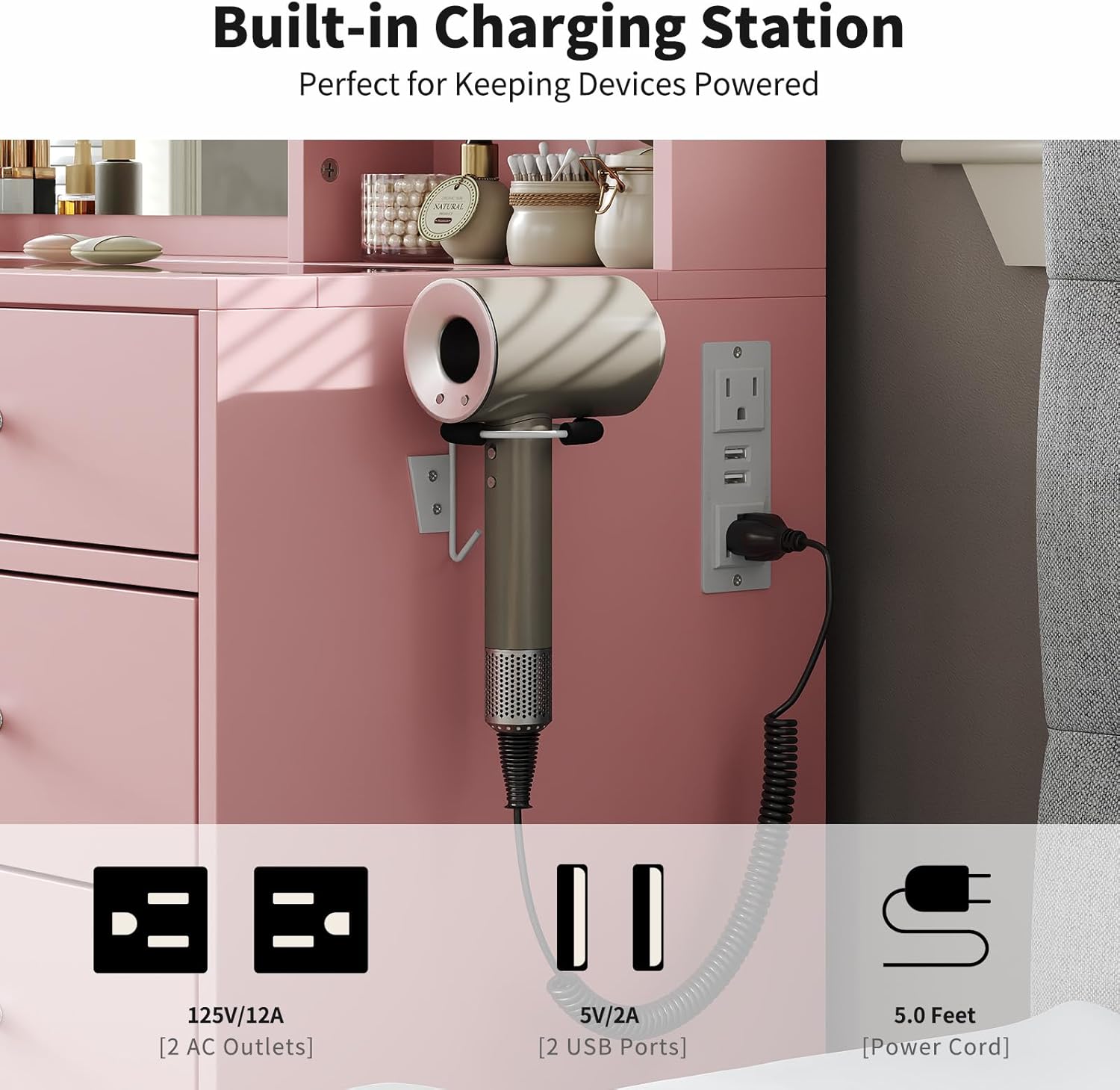 • 3 Lighting Modes & Brightness Adjustable: The vanity desk is equipped with an HD mirror and 10 bright Hollywood plastic bulbs, provides 3 color modes (warm/natural/cool) and adjustable brightness. This makeup vanity can meet all your different needs, perfect for home makeup, salon, and live broadcast., so you can experience the star-like makeup treatment