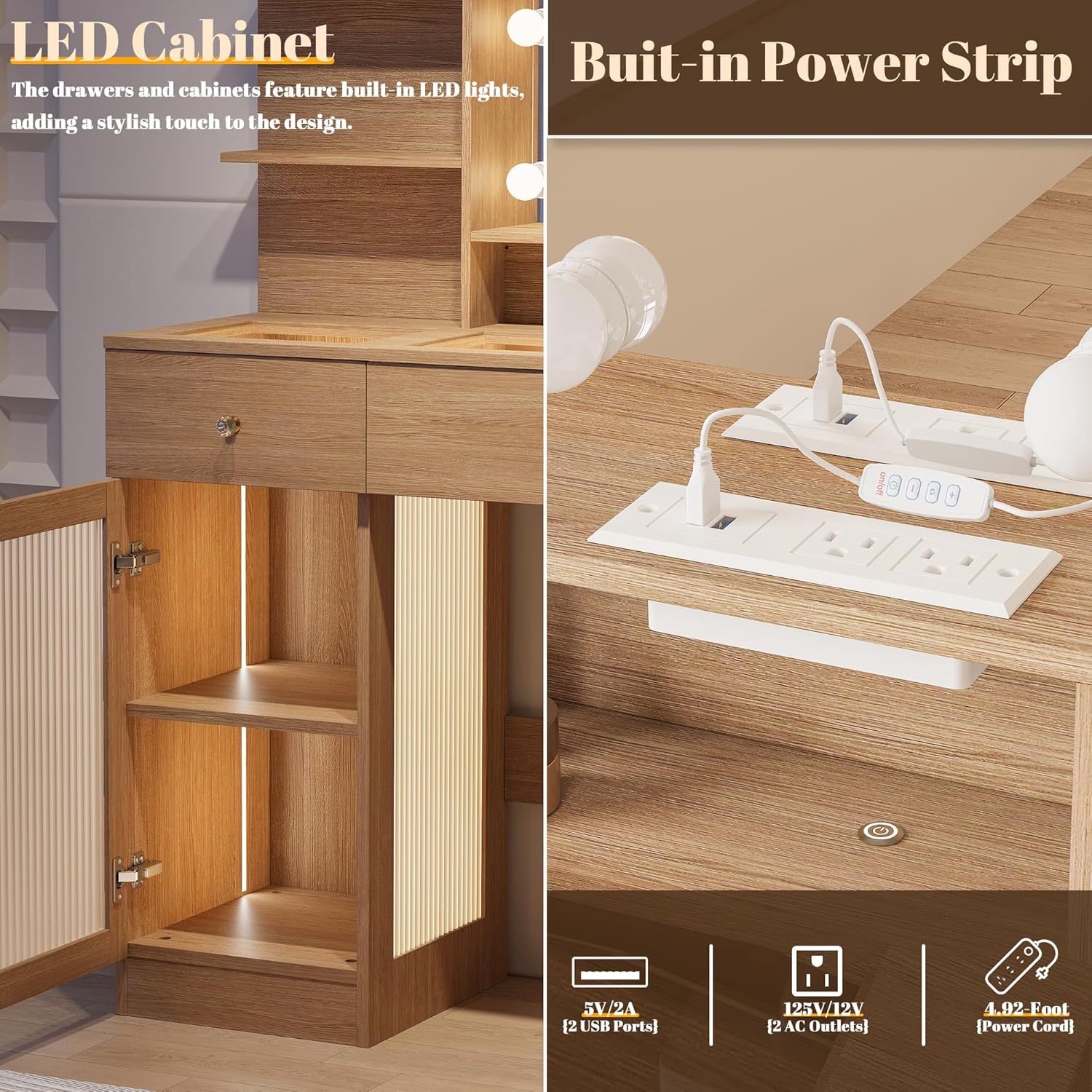 40" Vanity Desk with Large Mirror and Lights, Modern Glass Top Makeup Vanity Set with Power Outlet, Drawers and Cabinet, 3 Lighting Color Adjustable Dressing Table for Bedroom,Oak