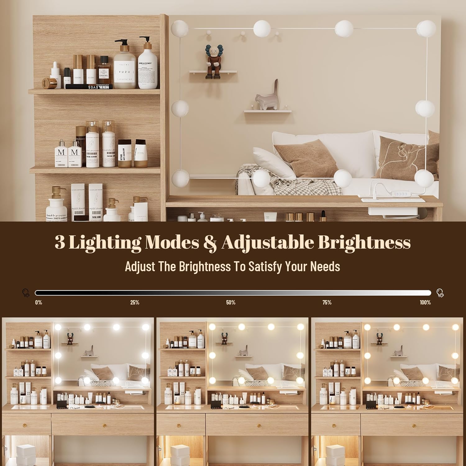 • 【Vanity Set with Large Mirror and LED Lights】This makeup vanity desk with lights features a large mirror with 10 Hollywood-style LED bulbs. Choose from 3 color modes (warm yellow, warm white, and cool white) and adjust the brightness settings to create the perfect lighting for your makeup needs. Ideal for home, work, hair salons, and studio makeup applications.