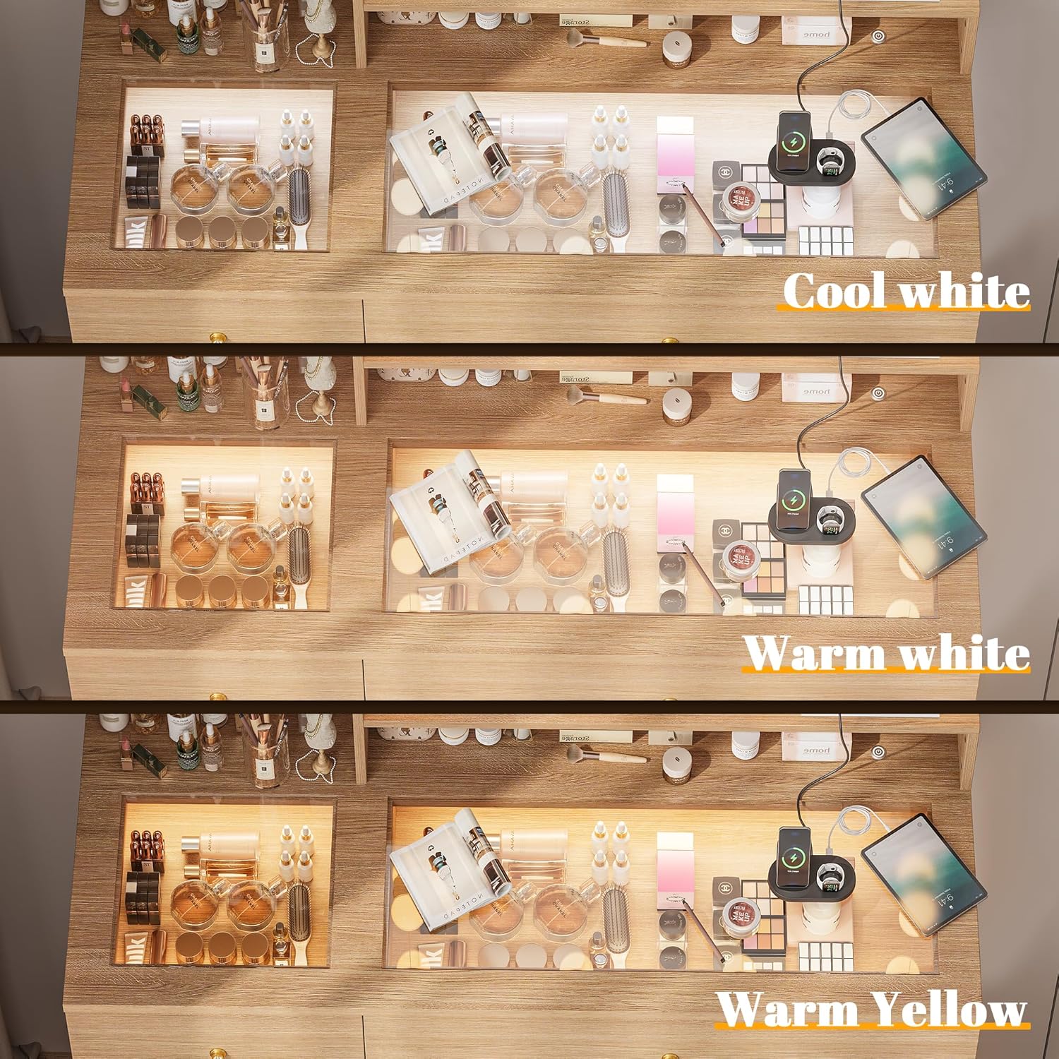 • 【Glass Top Vanity with RGB Drawers】white vanity desk is designed with a transparent tempered glass tabletop, you can easily see everything inside the vanity drawers. The built-in LED lights feature three color temperature modes, adding a touch of brightness and style to any room.