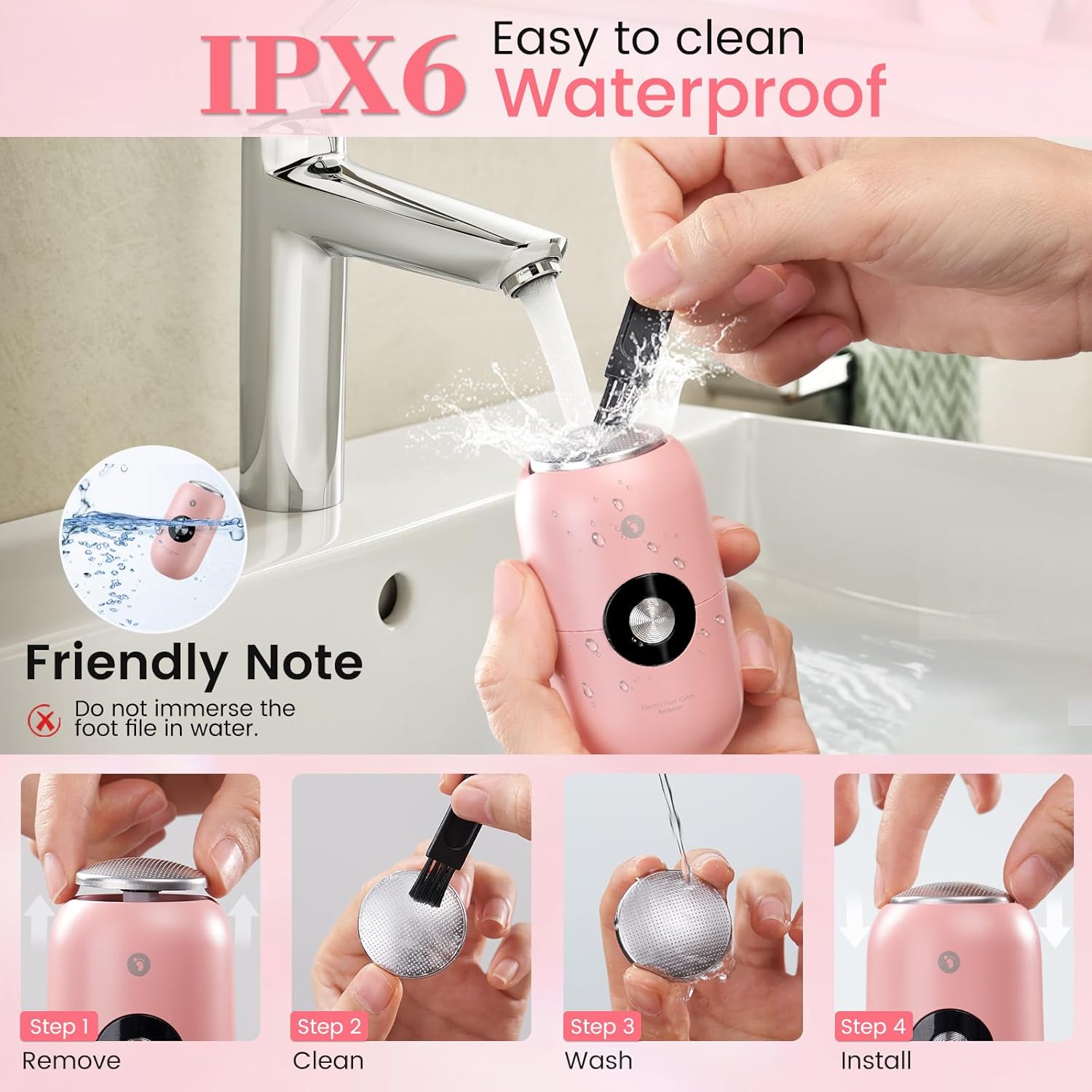 • IPX6 Waterproof Foot File-Wet or Dry Use: The high-speed grinding head removes calluses from dry or wet feet with a light touch—no need for heavy rubbing . After use, simply rinse it under the faucet; debris washes away instantly, eliminating the hassle of manual cleaning.​ Note: Keep it away from the charging port to avoid soaking and extend its lifespan.