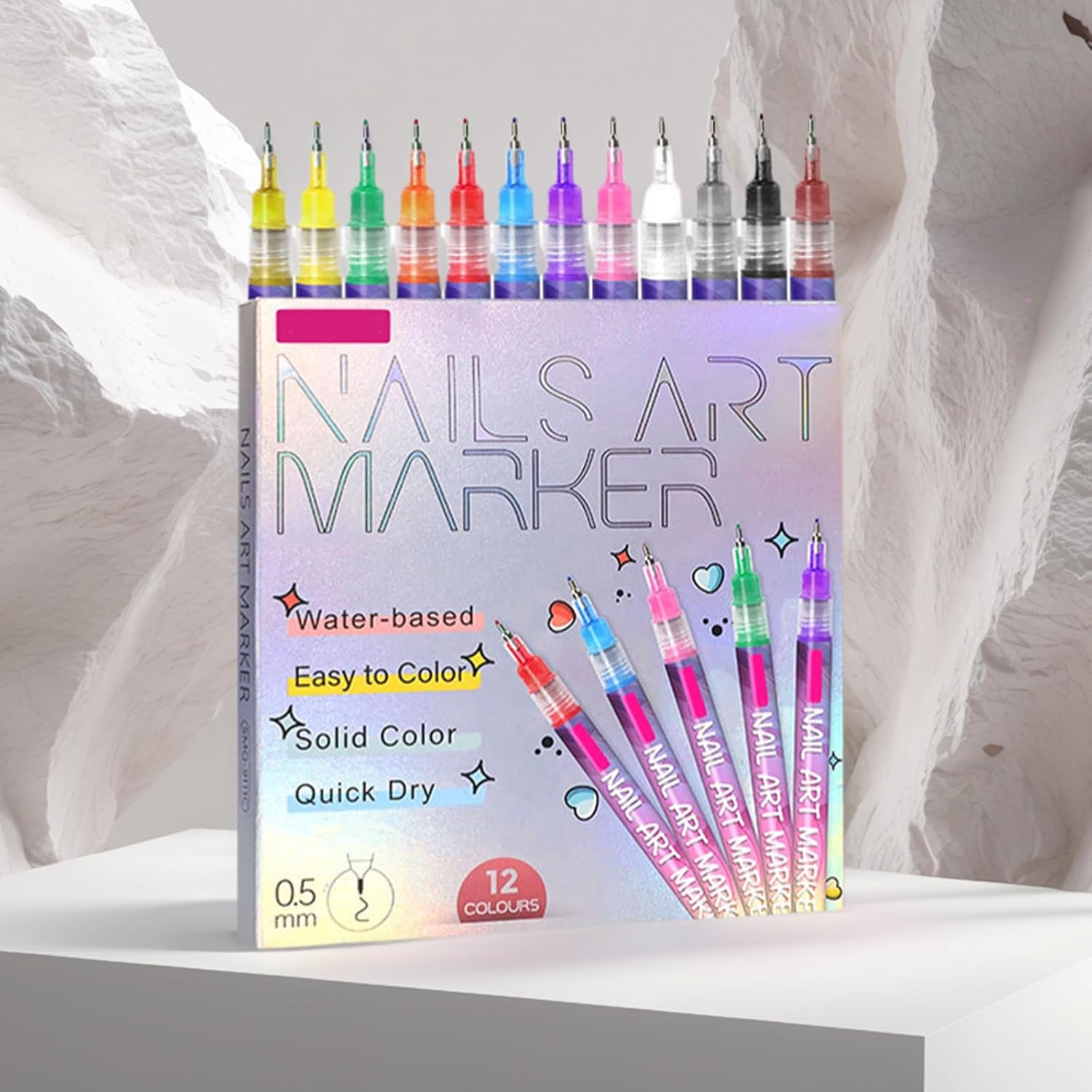 12 Color Nail Art Pens, 0.5MM Nail Art Markers Set, Quick-Dry Waterproof Nail Pens for DIY Painting Nails, Manicure Tools for Beginners & Pros (1 Set)